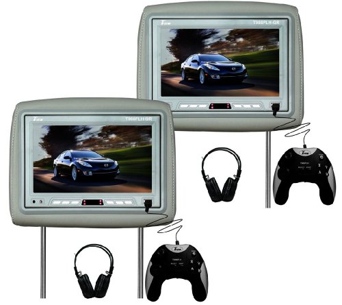 PACKAGE: PAIR OF BRAND NEW TVIEW T988PLH-GRAY 9" TFT-LCD CAR HEADREST MONITORS WITH PILLOWS + (2) VIDEO GAME CONTROLLERS + 27 VIDEO GAMES + (2) WIRELESS HEADPHONES + 2 REMOTES + WIRING INCLUDEDFeatures for monitor:9" TFT-LCD Monitor Car headrest with Touch ButtonsBuilt in IR Stereo Transmitter (2.3/2.8/3.2/3.8Mhz)Wide Screen: 16:9High Resolution: 480 X 234/1440 X 234Color System: PAL/NTSC Compatible Touch ButtonTwo Audio InputTwo Video InputTube diameter: 0.4/0.48/0.50/0.56 inchDistance of Poles: 5.3-7.3 inches adjustableOn screen menu displayDC 12 V power supplyBlue screen when no signal inputAdjustable picture, brightness, contrast, volumeCapable of dual channel or signal channel headsetsPower on/offBright backlit displayVideo 1 and Video 2 switch able from monitorStrong IR signal (2 IR Sensors in each monitor)Product Net Weight: 4.6 lbsAvailable in Black, Grey & TanProduct measurement: 12 x 9.1 x 5 inchesFeatures for headsets:(2) dual channel headsets includedfoldableVolume controlOn/OffDurable ABS Plastic ConstructionAdded Padding & Adjustable Band for Individual ComfortWide Angle IR Sensor for Great ReceptionA/B channel switchFrequency Response: 30 - 20.000 HzRange :10 MetersLED Statusbatteries included